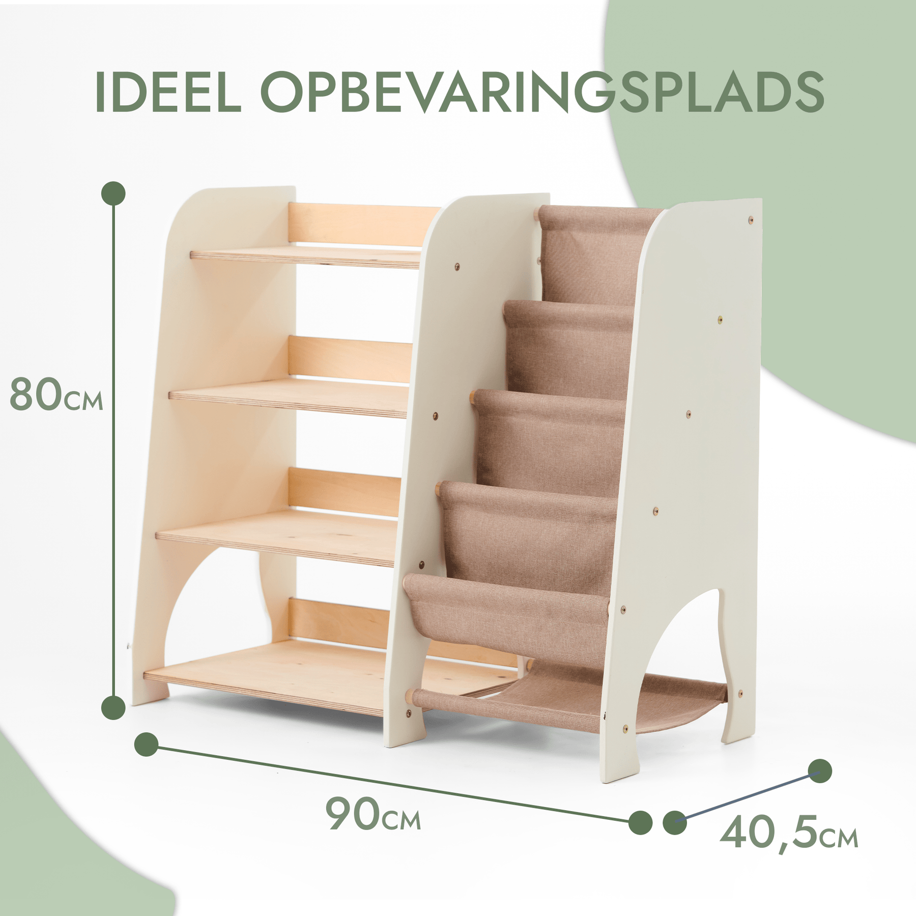 Reolen har to separate rum, som hjælper med at organisere pladsen og opmuntrer børn til at holde orden. Den følger Montessori-principperne, så dit barn selvstændigt kan vælge, hvad det vil lege med eller udforske. Det fremmer initiativ, organisering og lyst til at lære gennem hverdagens aktiviteter. Med denne reol bliver oprydning en enkel og sjov rutine.