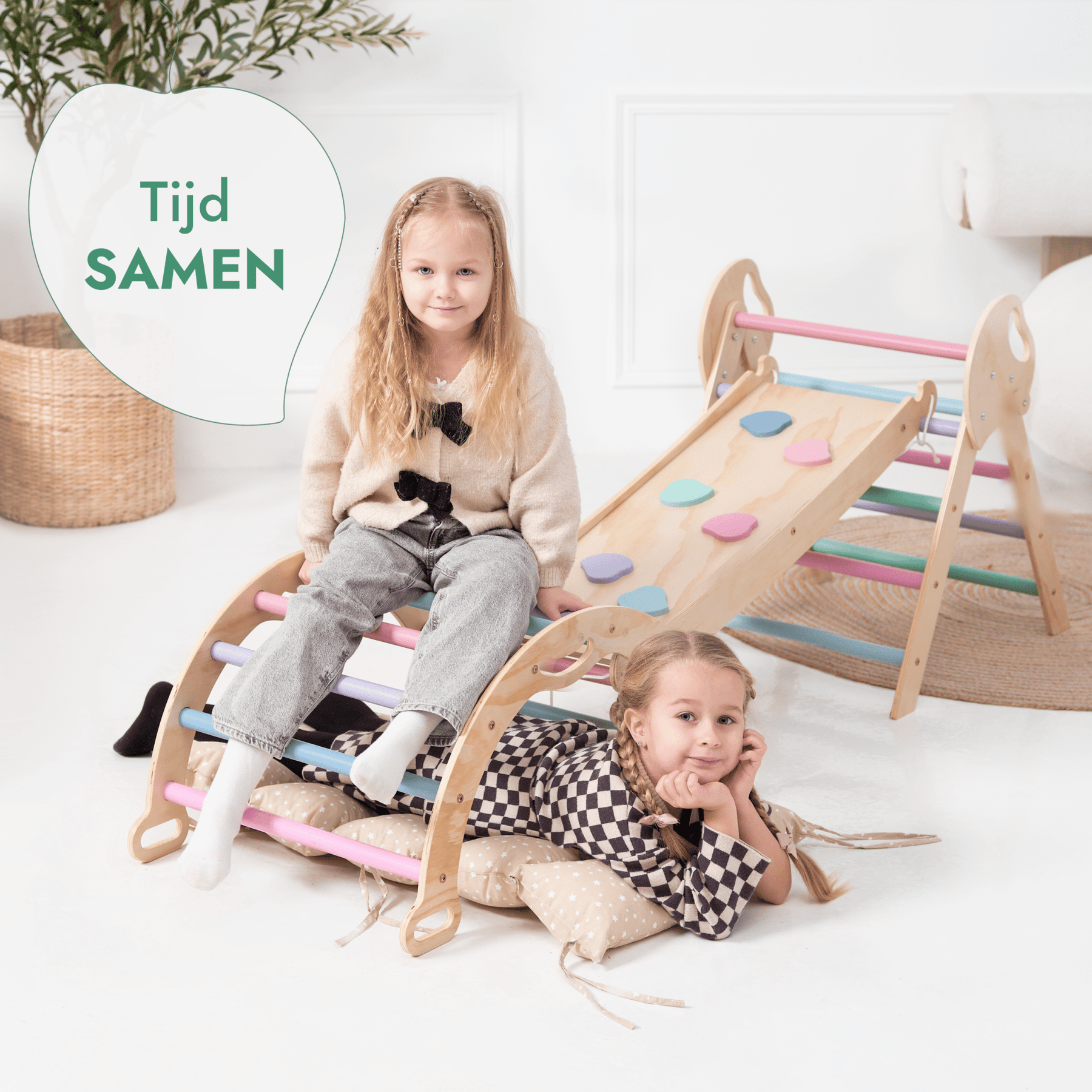 4-i-1 Klatresæt til småbørn: Trekantstige + Træbue + Rutsjebane + Pude (til børn fra 1–3 år) - Pastel