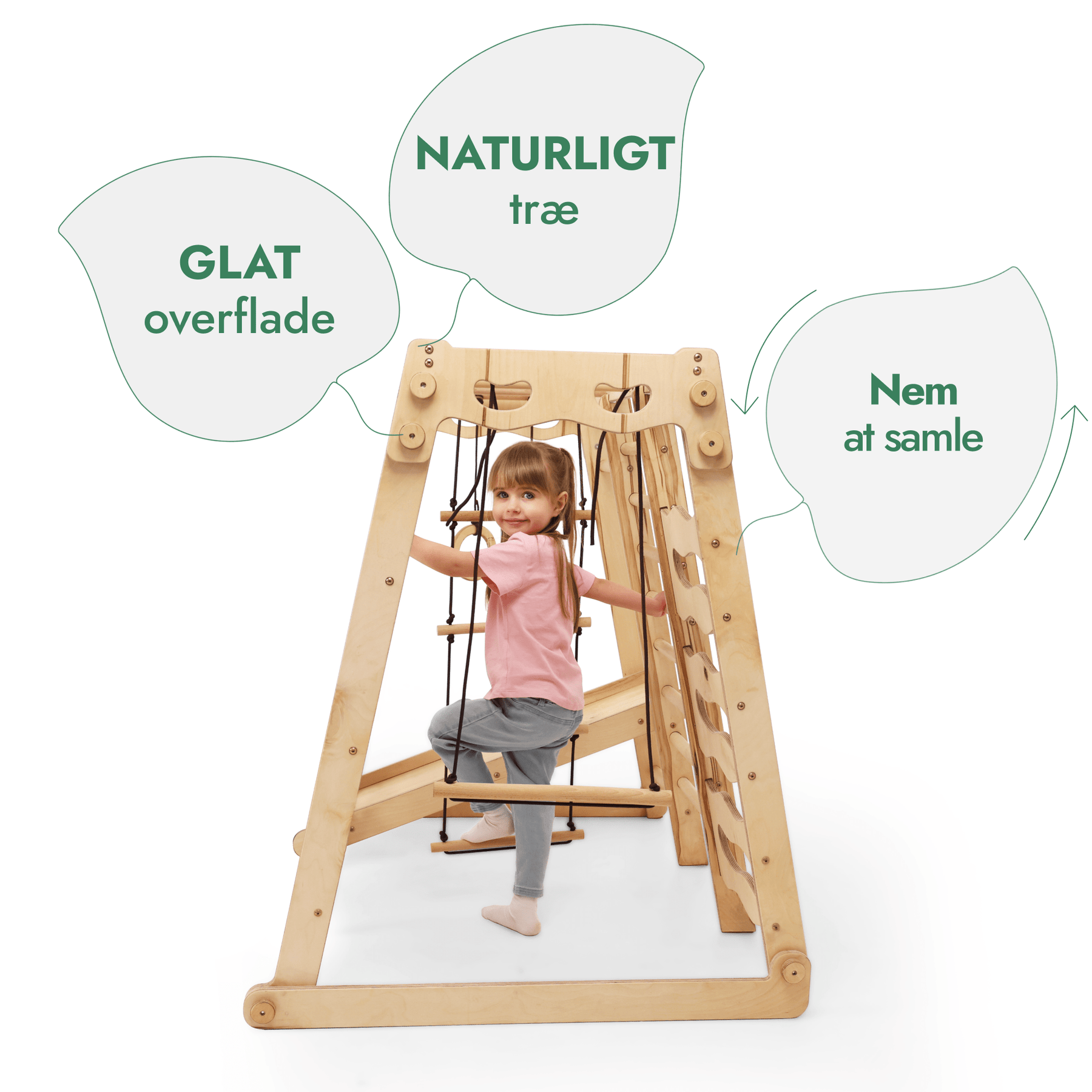 Naturlige materialer: Der benyttes træ i høj kvalitet og sikre olier, der er kvalitetscertificeret. Overfladen er slebet omhyggeligt i hånden, for at barnet skal være bedst muligt beskyttet.