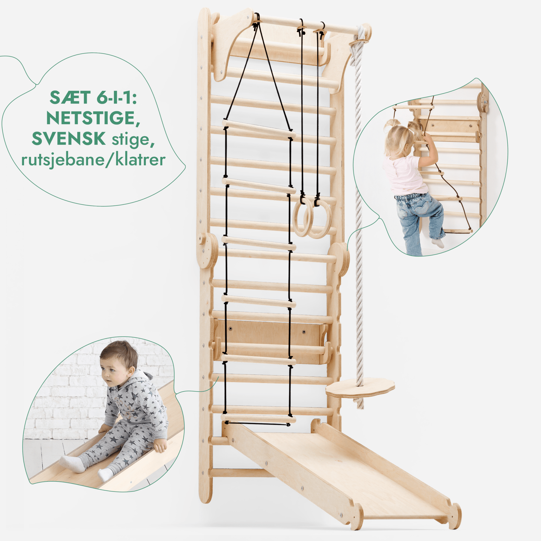 6i1: Svensk Trævæg / Klatrestige til børn + Gyngestativ + Rutsjebane