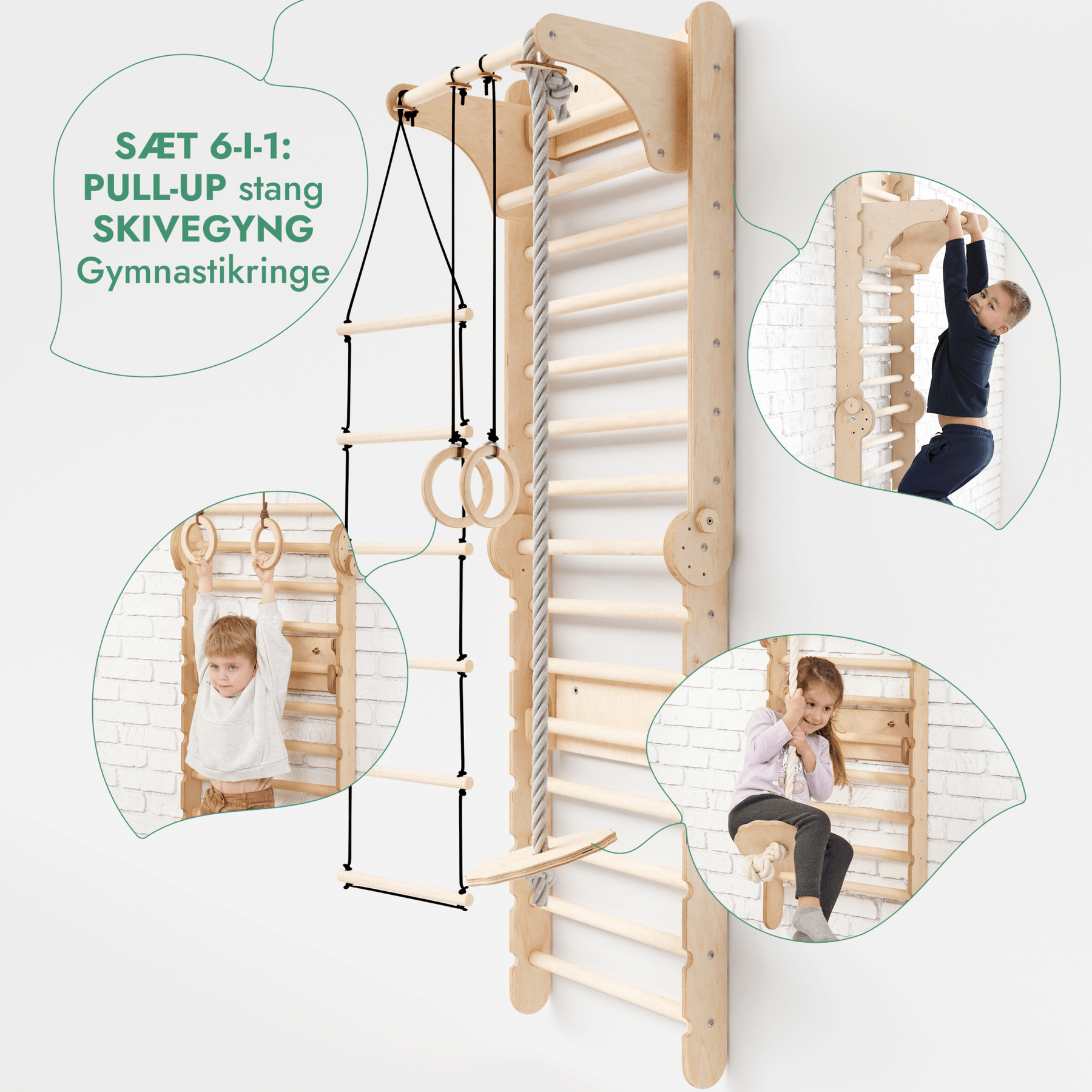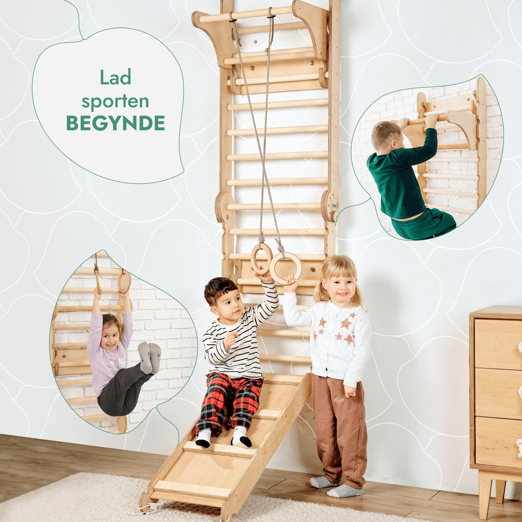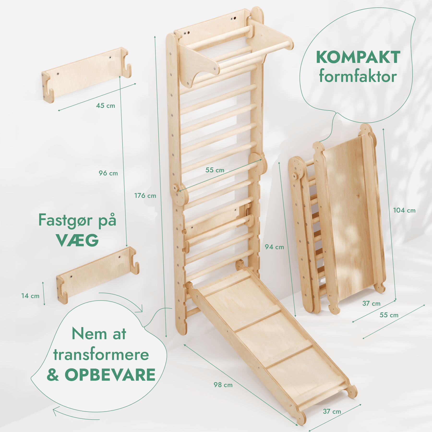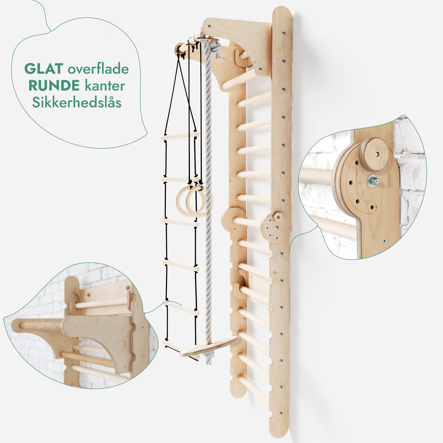 Det alsidige design gør det nemt at forvandle væggen til en Pikler-trekant med en rutsjebane, hvilket giver endnu flere muligheder for bevægelse og leg. Sættet inkluderer også tre forskellige gynger for at skabe variation og sjov. Goodevas svenske væg er mere end bare leg — det handler om udvikling, sikkerhed og holdbar kvalitet.