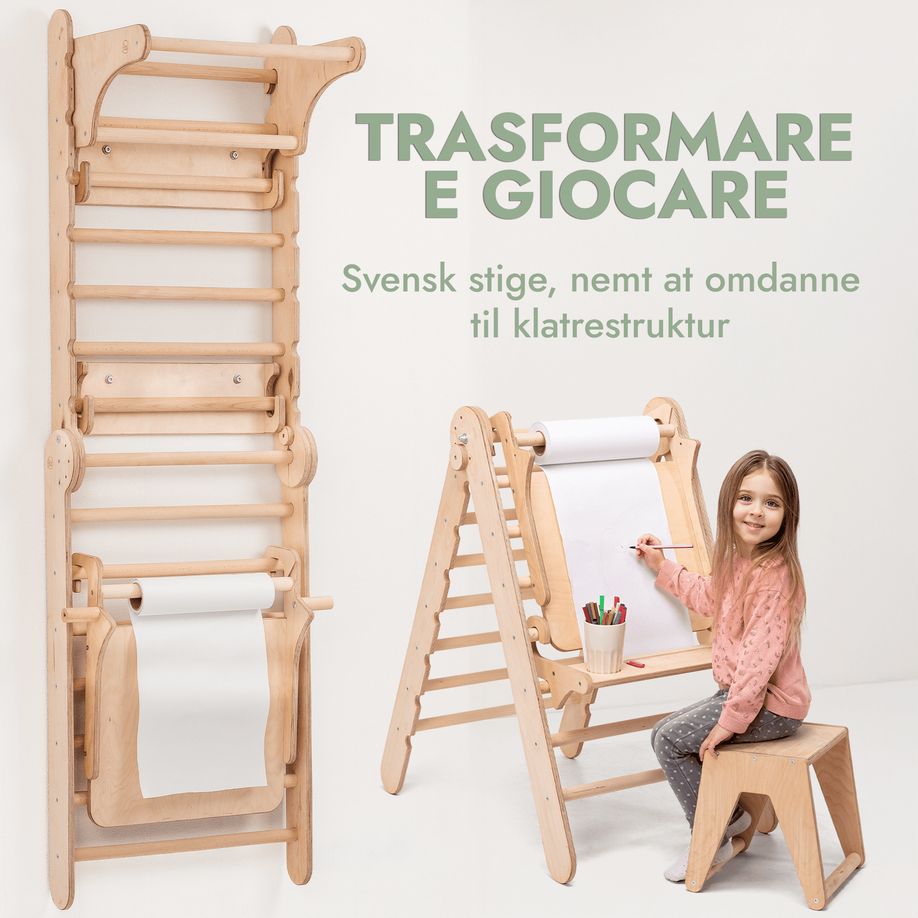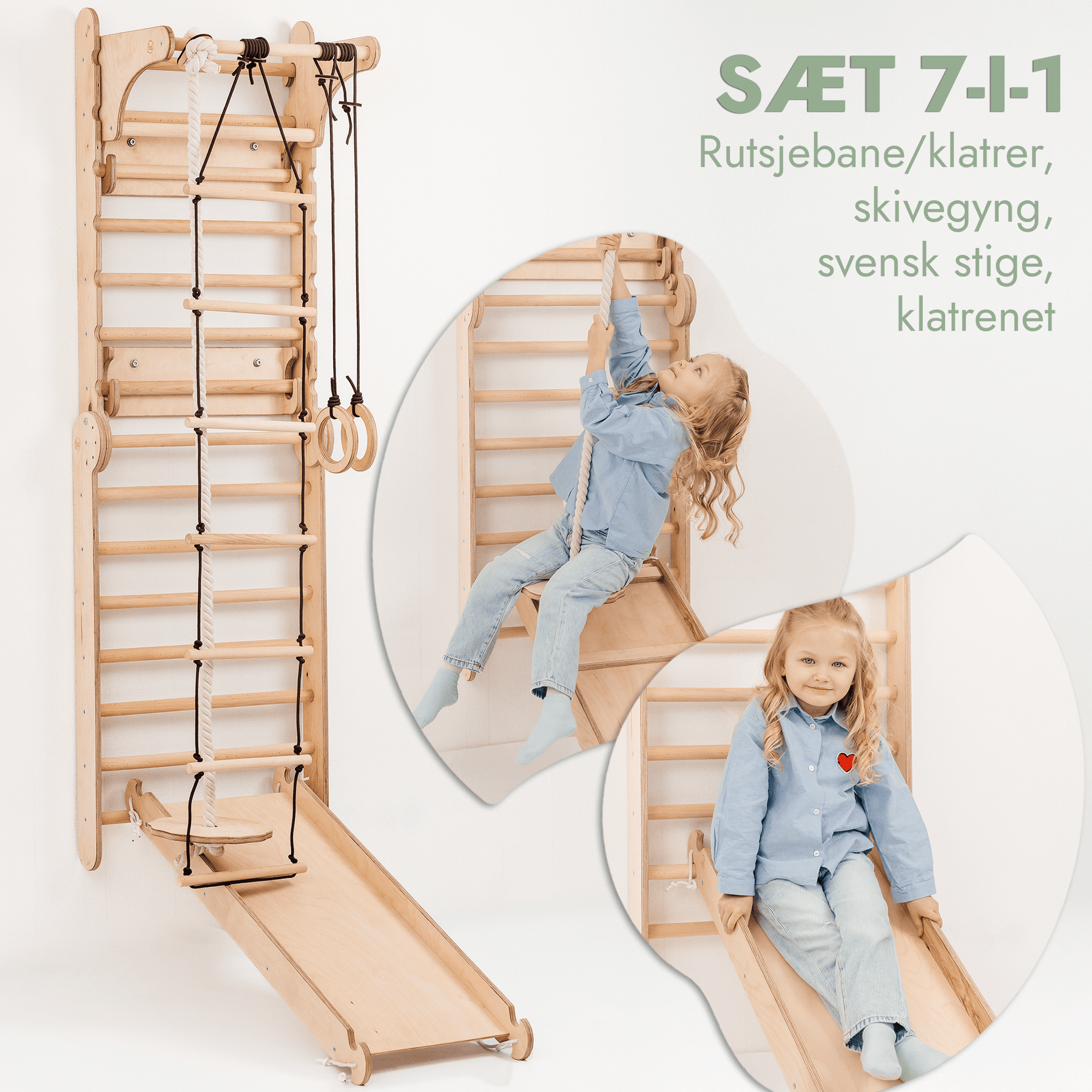 7in1: Svensk Trævæg / Klatrestige til børn + Gyngestativ + Rutsjebane+ Kunst Tilføjelse