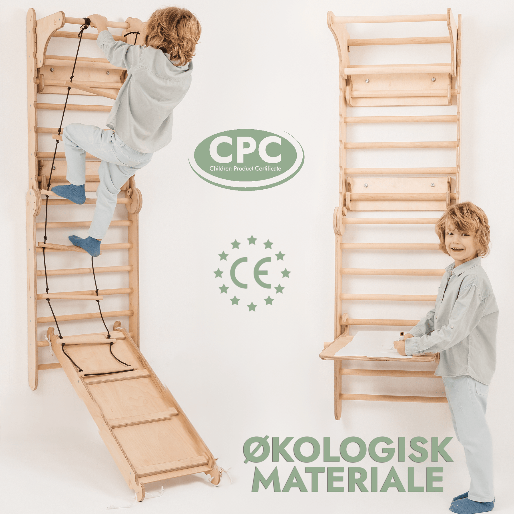 Det alsidige design gør det nemt at forvandle væggen til en Pikler-trekant med en rutsjebane, hvilket giver endnu flere muligheder for bevægelse og leg. Sættet inkluderer også tre forskellige gynger for at skabe variation og sjov. Goodevas svenske væg er mere end bare leg — det handler om udvikling, sikkerhed og holdbar kvalitet.