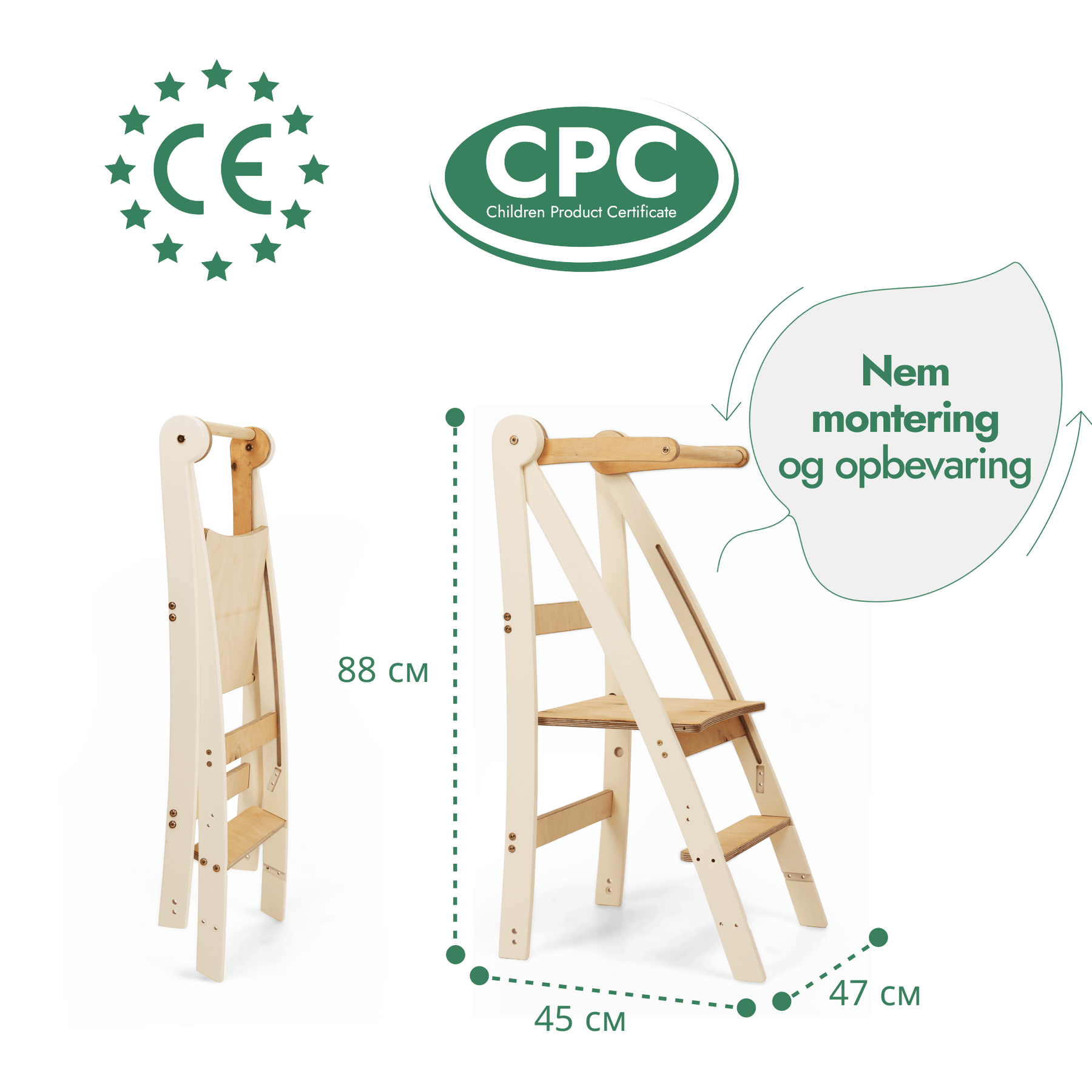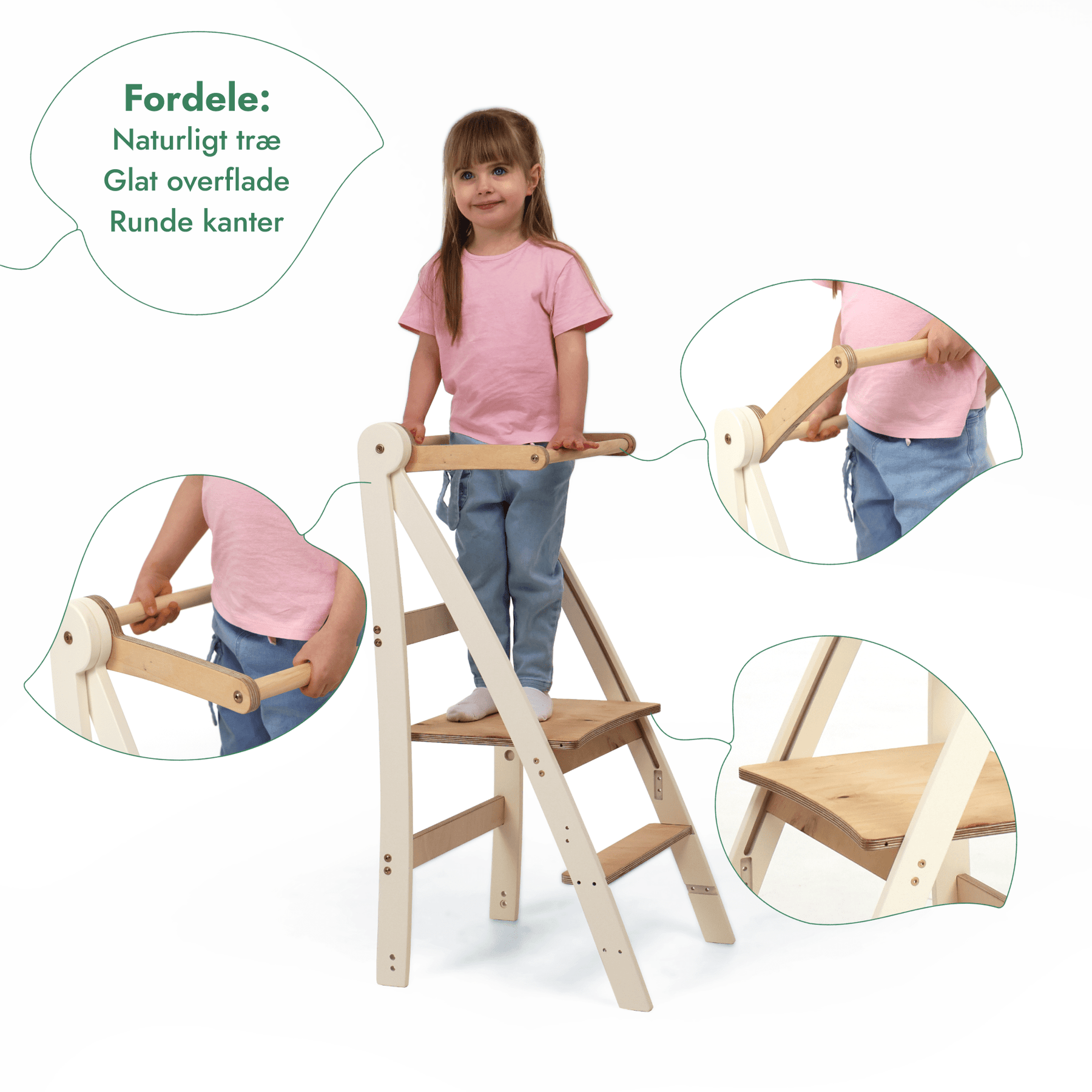 Lad dit lille barn udforske, lære og vokse med selvtillid! Fra at røre og ælte dej til at skære, skive, hælde og endda børste tænder eller vaske op – hverdagens opgaver bliver sjove og lærerige med hjælp fra vores foldbare læringstårn til småbørn.